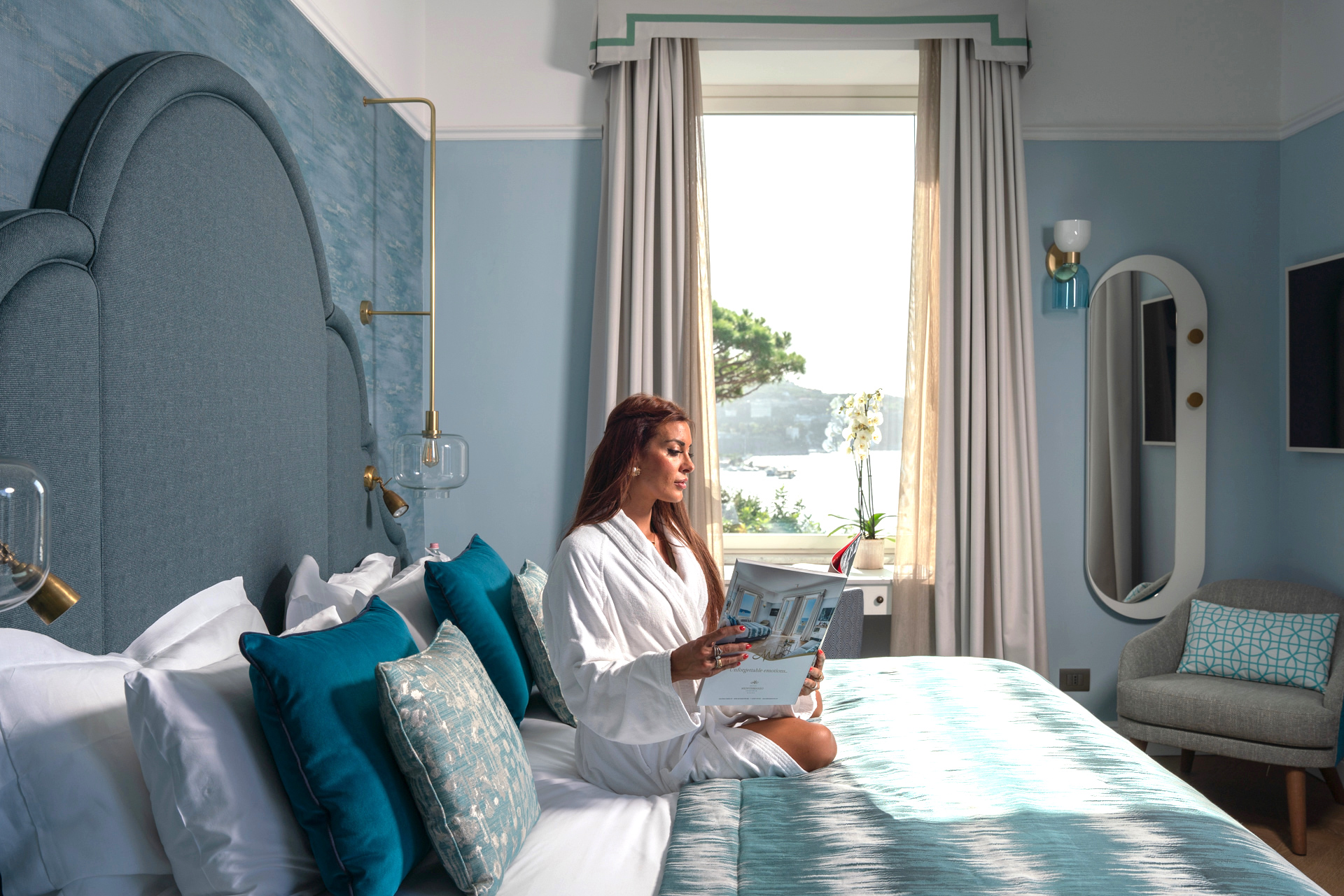 The Mediterraneo’s furnishings, lighting, and accents harmonize with the original architecture, while a contemporary color scheme of dark and light teals, burgundy, and white echoes the palette of the natural landscape. Each of its 61 rooms is sophisticated and cozy, harmonizing with the public areas. The expansive outdoor pool area and adjoining Aqua Pool Lounge are outfitted with beachy aesthetics and whimsical touches, such as a 1960s turquoise 2CV auto that makes the space look like a vintage travel poster come to life. The Oltremare Lounge Bar stretches from the front entrance to the back entrance. It multitasks as a glamorous meet-up spot for cocktails, champagne, and bar snacks right after arrival or before a night out in Sorrento, which comes alive with fashionable restaurants, including Michelin-star Ristorante Il Buco.