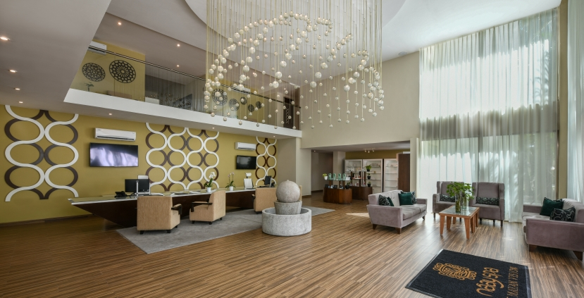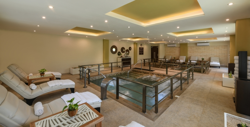 On the left side of the corridor, a set of doors leads to an impeccably maintained two-level fitness area with class spaces. As one familiar with large resorts would expect, it is well lit and enlivened with rock, R&B, and dance tracks coming out of the speakers, but at the perfect volume. The door on the left opens into the Spa at AVA Resort Cancun. Past those doors, one is enveloped in a space seemingly inspired by a cenote, with its evocative earthy colour palette of blues, grays, and tans.